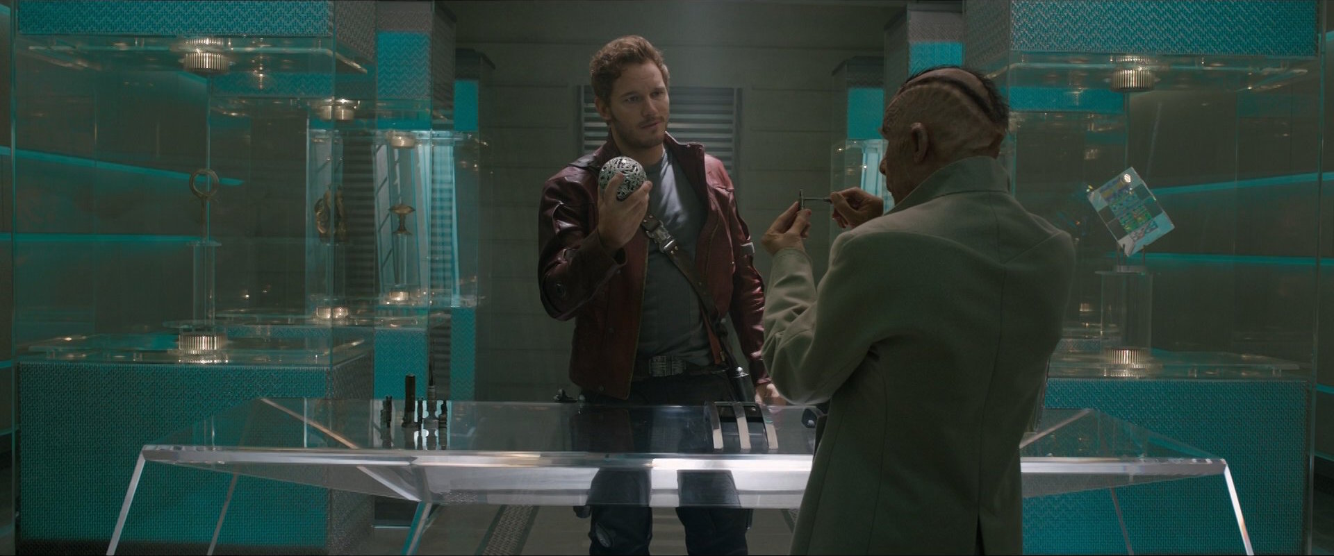 Where do I begin on this one? For starters, yes, the 3D is strong throughout, save for a couple flat shots when the camera goes into wide view. But what elevates Guardians above the rest of the MCU movies in terms of 3D is just how well its setting works with the format. You have surreal alien worlds, alien technologies, shots of deep space, and fluid chase sequences. And its switch from 2.39.1 to the IMAX ratios during the bigger scenes only helps make the film even more immersive. Even in its more modest scenes, though, the strong 3D doesn't back down, allowing for clear space between the characters and their environment. In shots down corridors, in public spaces, small rooms, and anywhere characters interact with one another, you feel the weight of the the environment around them. While I wouldn't say the 3D composition in many of the modest scenes is anything to brag about, there are some noteworthy moments where the strong depth is well-taken advantage of. In the large prison, the size and scale of the prison room is made much more apparent in three-dimensions. There are some neat moments that involves gates and fences. However, a few shots that really stood out to me involved a long distance shot of a story character who appears in the film for the first time, scenes that feature holograms, and shots that take place inside of Ronan's spaceship.