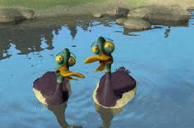 Unlike many of the other 3D films that came out pre-Avatar, this film doesn't seem to be striving for 3D thrills. Don't get me wrong, there are plenty of places in the film that are fun to watch, especially in 3D. But there's never really any moment that seems like it was specifically made with 3D in mind the same way the aforementioned Polar Express and Beowulf do. None the less, some of the shots we do get still pop in their own right. There are some moments that experiment with angles, especially on cliffs and dams. There's a high energy action sequence in which a dam bursts and water is rushing heavily through a canyon taking everyone for a wild ride. And at one point, it even involves a waterfall. There's a few shots of a small river where the surface sometimes protrudes the screen and other times, you can look through it to the bottom. And there's even a couple neat moments involving mirrors, even when one of them is in a pretty serious moment. There's also an ample amount of pop outs. The animals and their noses which stick out far from their heads, especially in the case of Boog and Elliot, are some of the best examples of this. But we still get everything hurling at us from fish to water to raindrops to Shaw to his gun to his knife to a marshmallow stick. There's one scene in particular that involves bubble gum, cereal, potato chips, money, cans, and pizza coming right out at you.