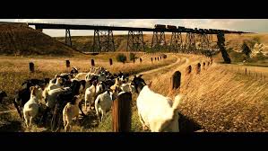 Now let's get onto where I think the 3D works even though either the director didn't actively intend it to or he did, but in a way so subtle it seems so effortless. The environments in this film in general are the biggest example. The farm has those aforementioned grassy plans that are lush to look into. But it also has mountains in the background, plains that stretch for miles, even herds of goats and fences pop in the native 3D. Even outside of farms, the insides of trucks and vehicles feel more immersive, an indoor college classroom with a stadium-like seating arrangement looks nice and is captured well, and even a fancy dining hall with individual seats and people sticks out more in 3D. There aren't a whole lot of crowd shots in T.S. Spivet. But in the few that are there, the third dimension gives us a mesmerizing level of detail that lets us know what kind of environment we're in, with the dining hall scene being one of them, of course (that one scene honestly reminds me a bit of The Great Gatsby if I'm being honest). Even in scenes that are slightly more intimate, the 3D depth, or the lack thereof, can add to the scene. It can range from situations more mundane such as in the kitchen/dining room of a humble home where you can feel the distance between characters, to much more serious moments like with Layton's wagon stored in a small shed or when two characters are crouched up mourning in the corner of a room. There's an interesting moment full of intimacy where T.S.'s family are all surrounding the phone talking at once to the young boy expressing a mix of concern and joy that he's alive. And then that intimacy is contrasted immediately in the next shot when we see T.S. himself far away from the phone booth. It's little moments like that where 3D makes the drama of the scene all that much more apparent.